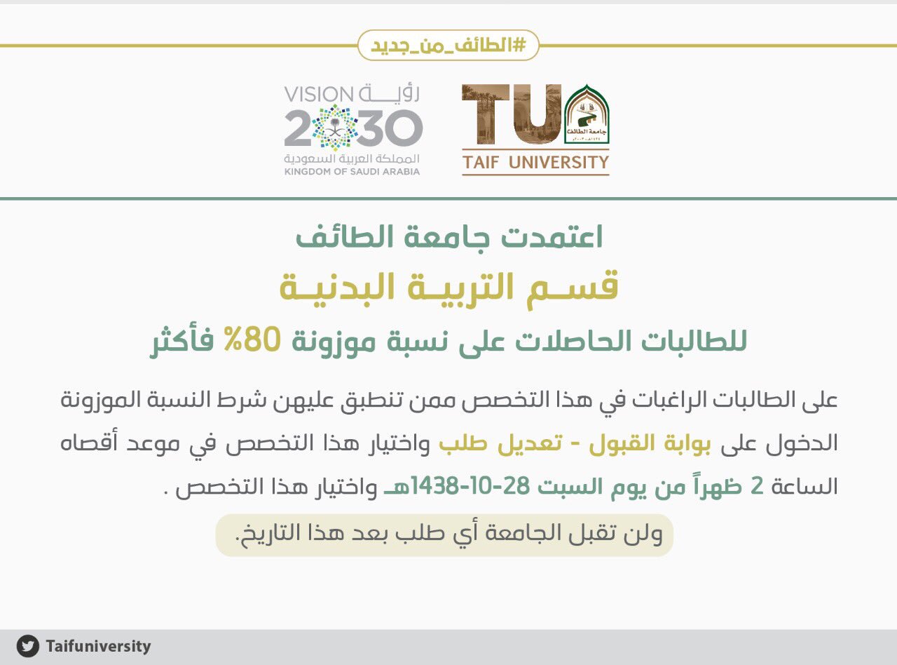 جامعة الطائف Sur Twitter جامعة الطائف تستقبل طلبات الإلتحاق بقسم التربية البدنية للحاصلات على نسبة موزونة 80 فأكثر الطائف من جديد