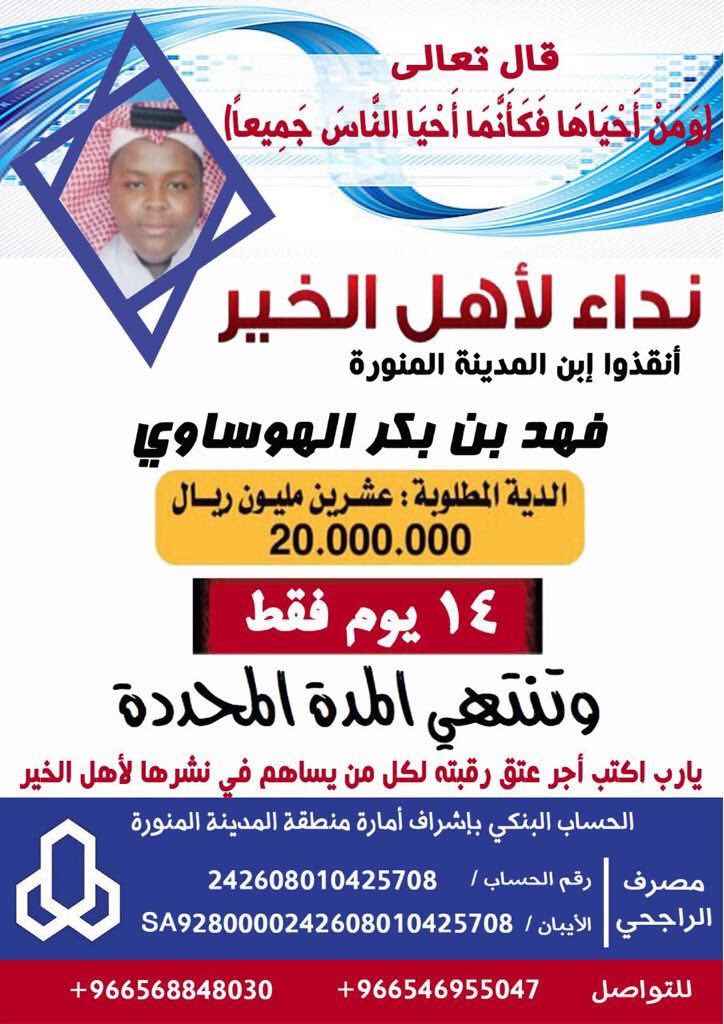 قــروب أهــل المـديــنــة On Twitter عتق رقبة فهد الهوساوي يبلغ من العمر ٢٢ عاما موعد تنفيذ القصاص ٢٩ رمضان السهم 15 ريال رقم الحساب بإسم أمارة المدينة المنورة 242608010425708 الآيبان