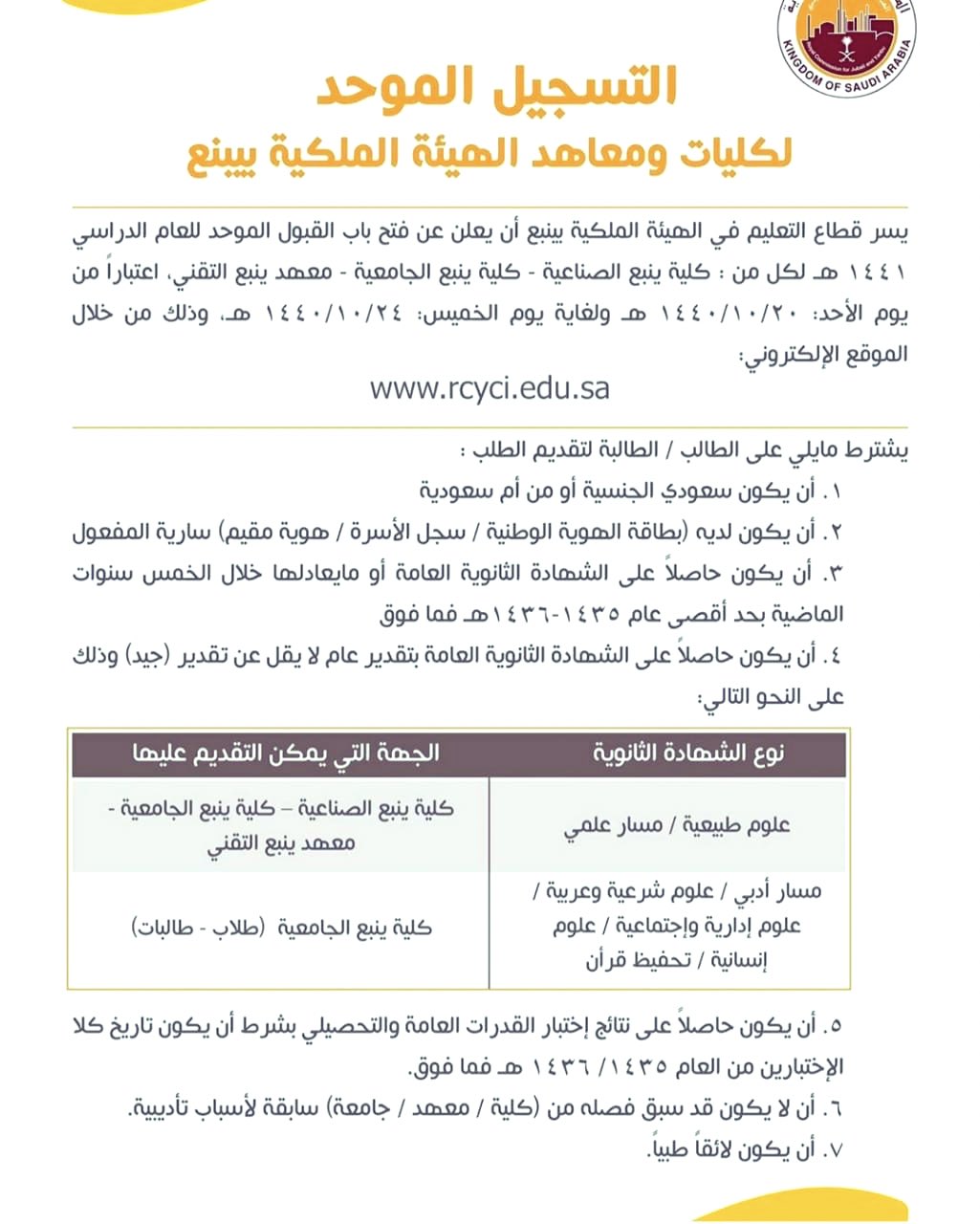 ه م م ال م د ائ ن Sur Twitter الهيئة الملكية بينبع تعلن فتح باب القبول الموحد للعام الدراسي 1441هـ الكليات والمعاهد 1 كلية ينبع الجامعية 2 معهد ينبع التقني 3 كلية ينبع الصناعية موعد التقديم
